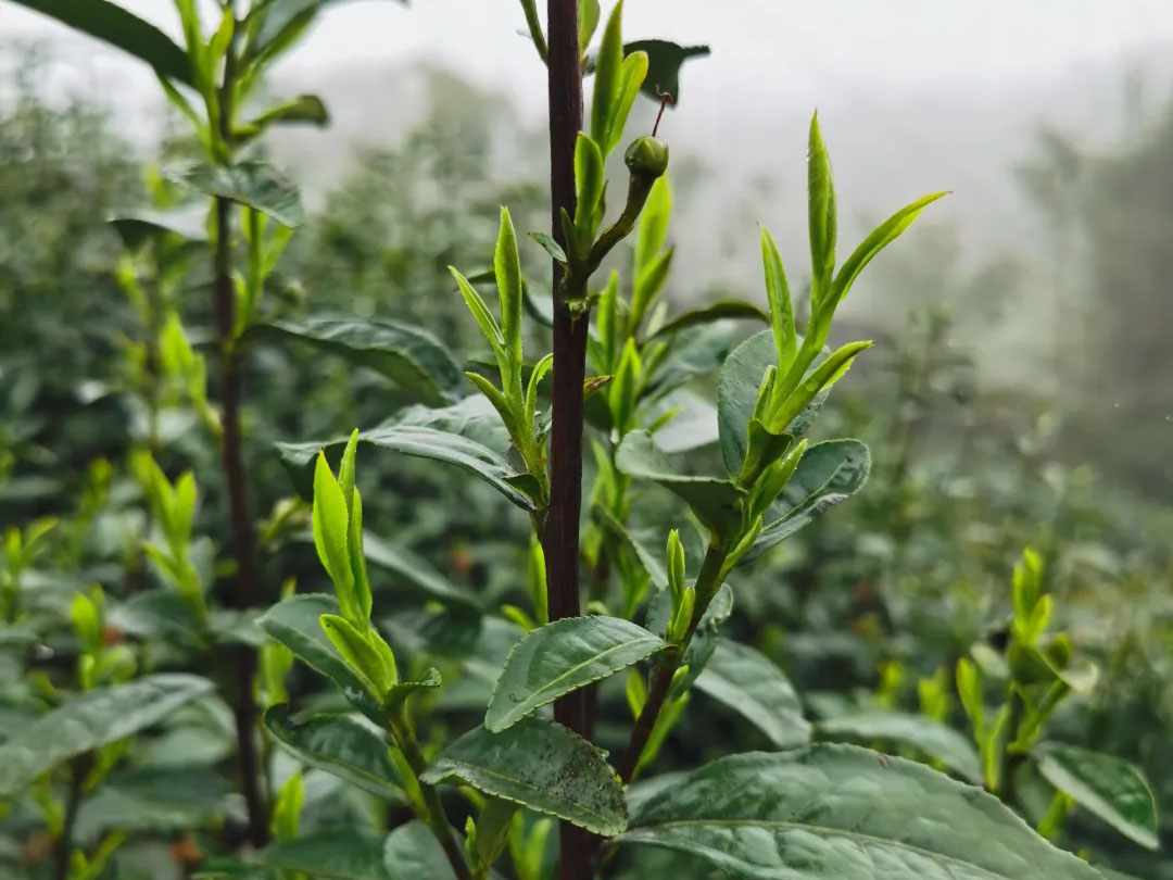 远处云雾,近处茶树,吐新芽迎新春。